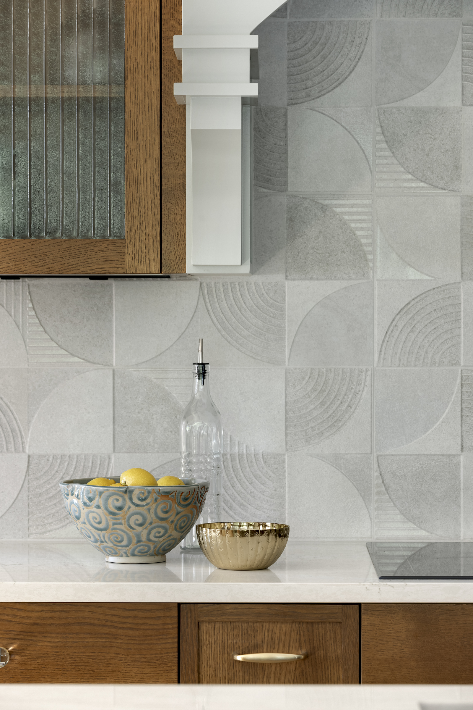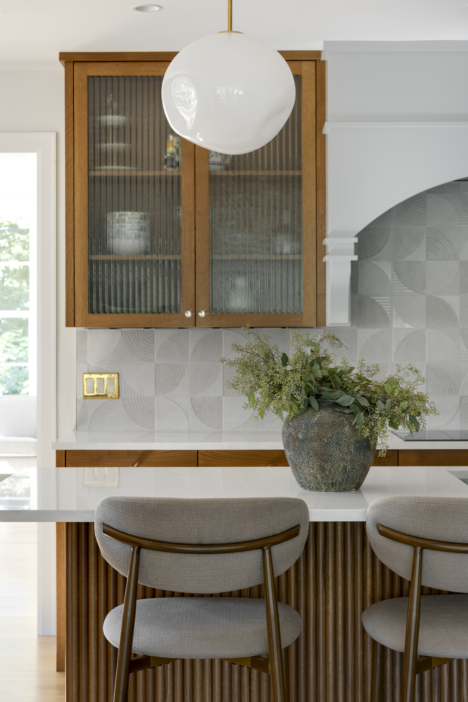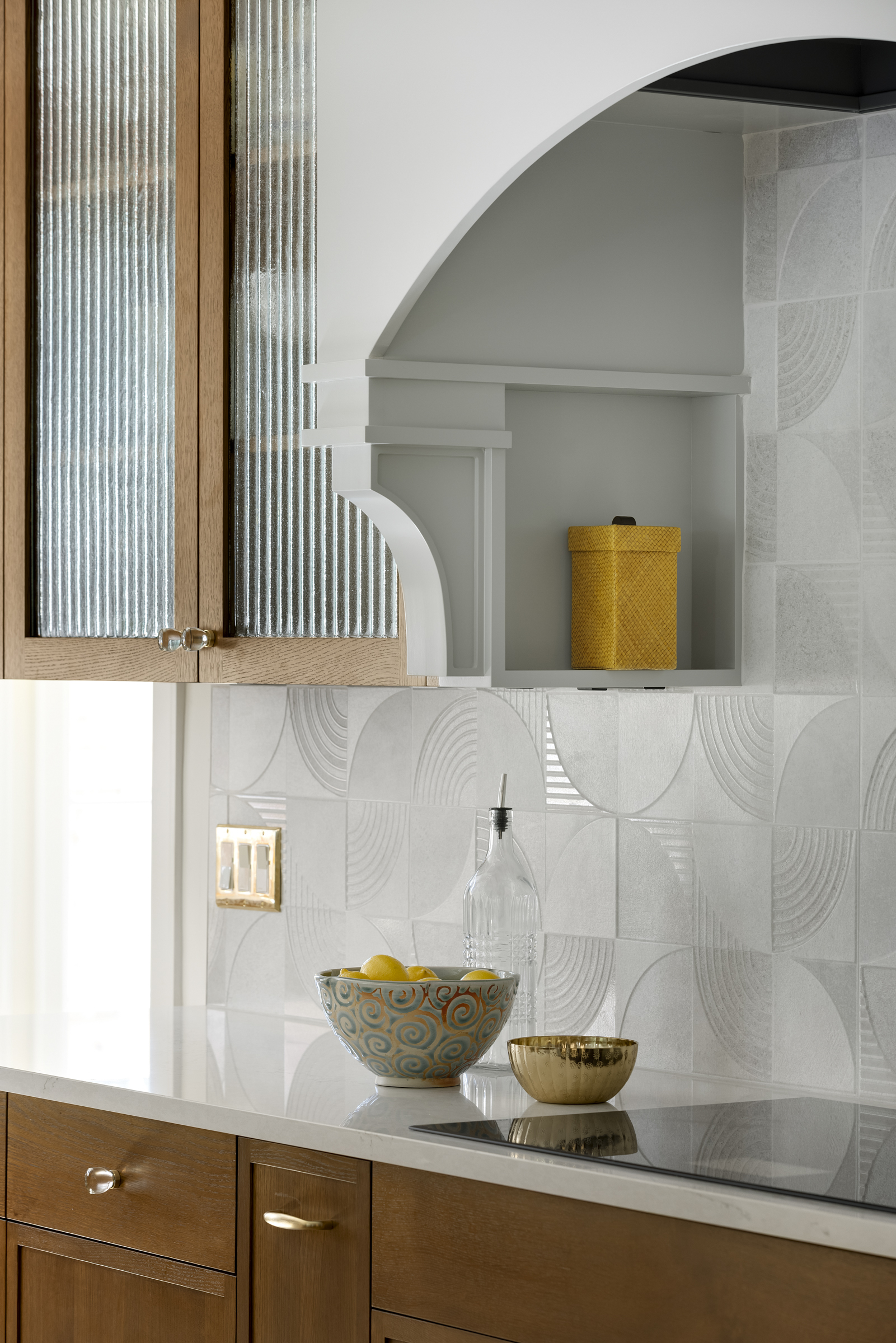 <p>A circular-patterned backsplash tile and fire-infused glass in the doors add depth in this kitchen with large island. </p>