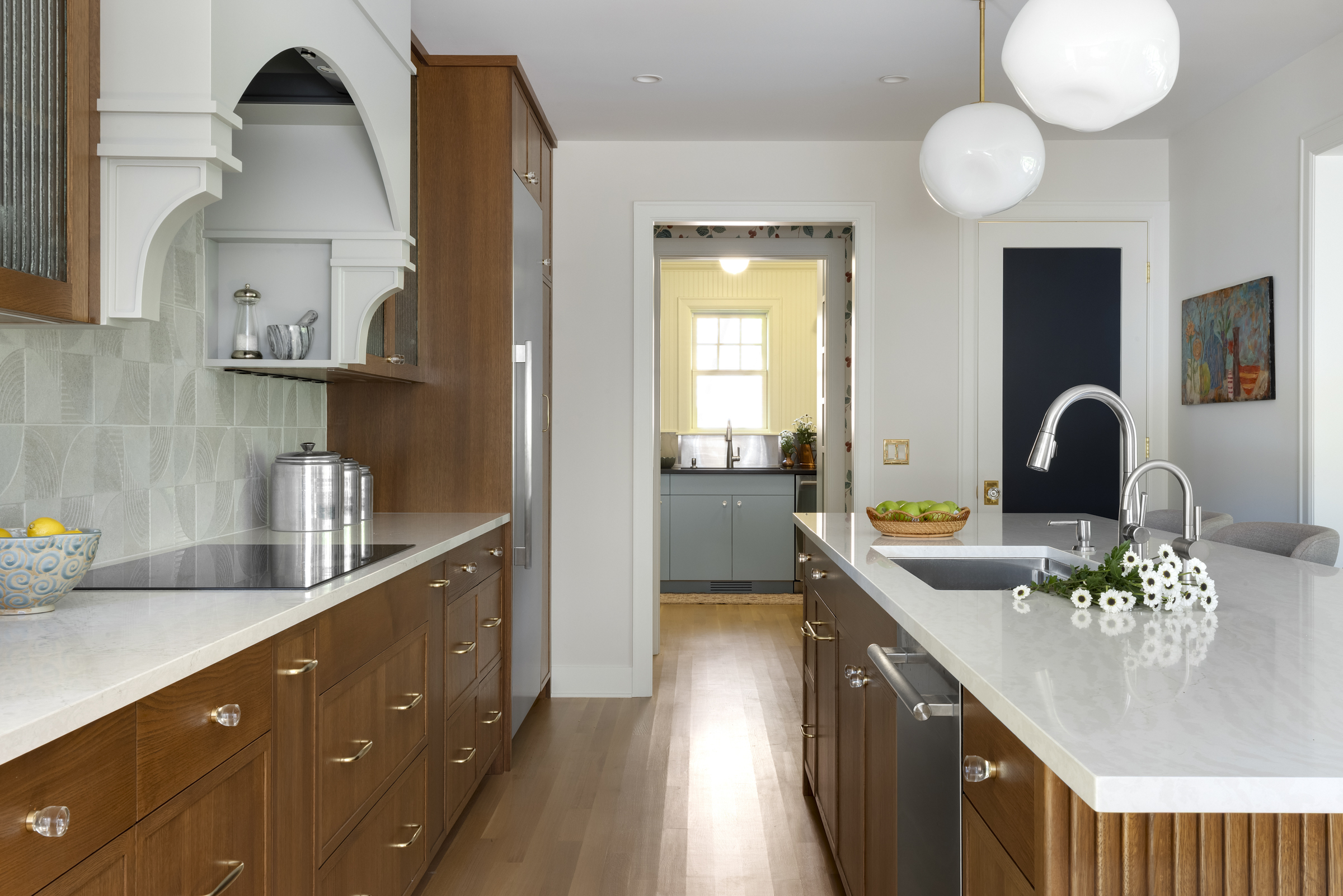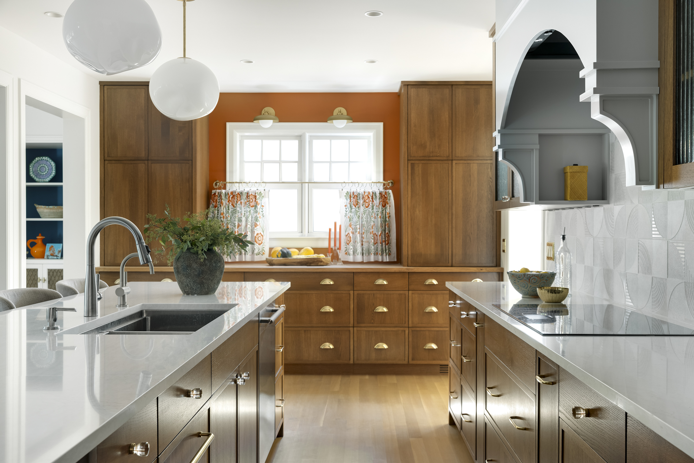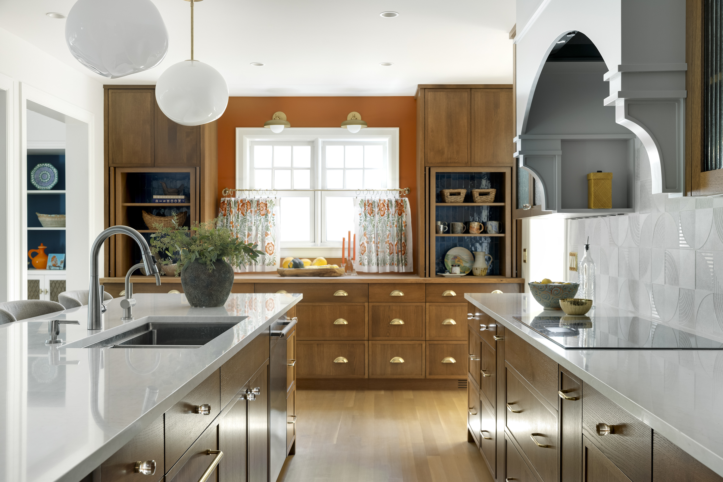 <p>A circular-patterned backsplash tile and fire-infused glass in the doors add depth in this kitchen with large island. </p>