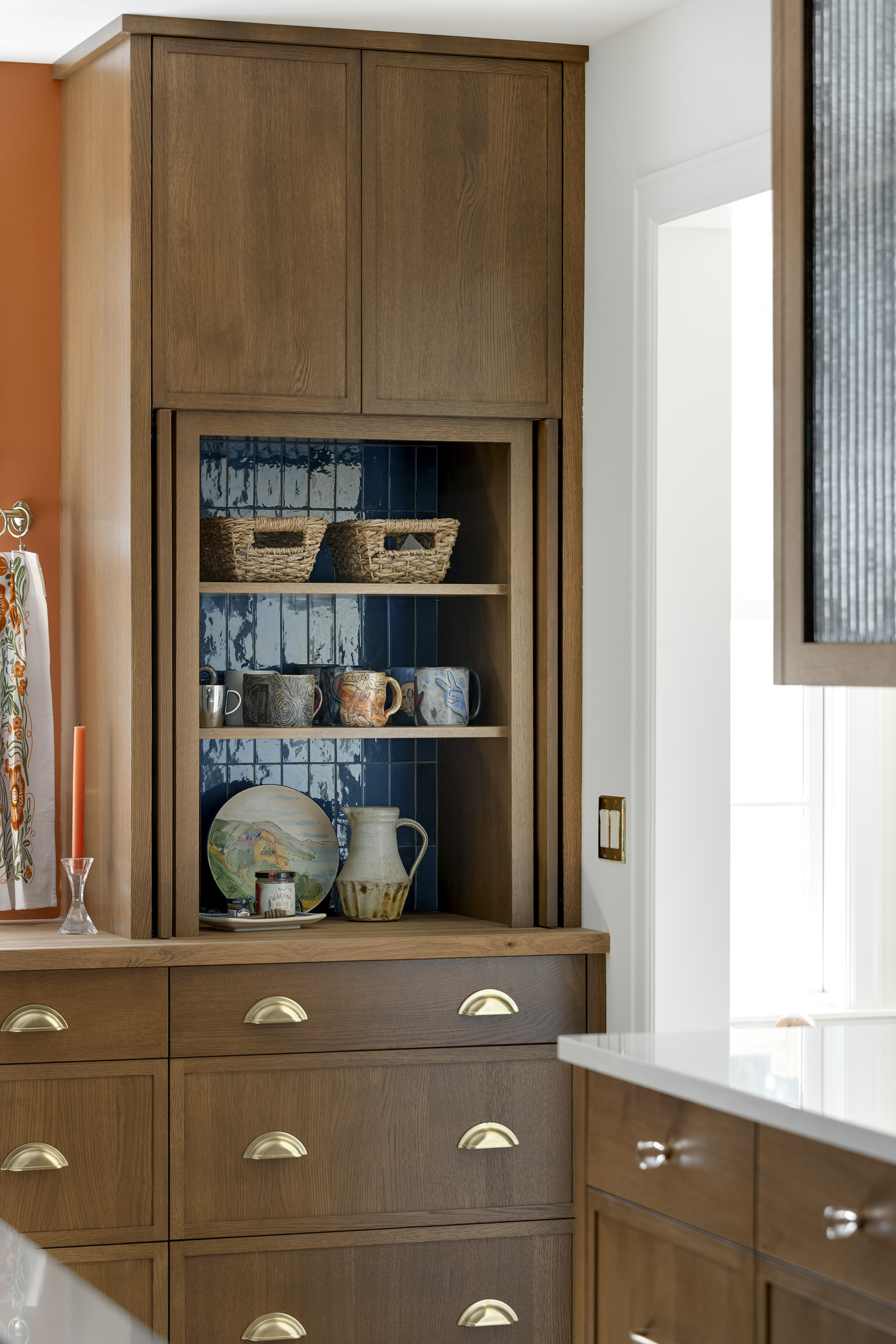 <p>White oak cabinetry with custom hideaway doors for added display combine beauty for practicality.</p>